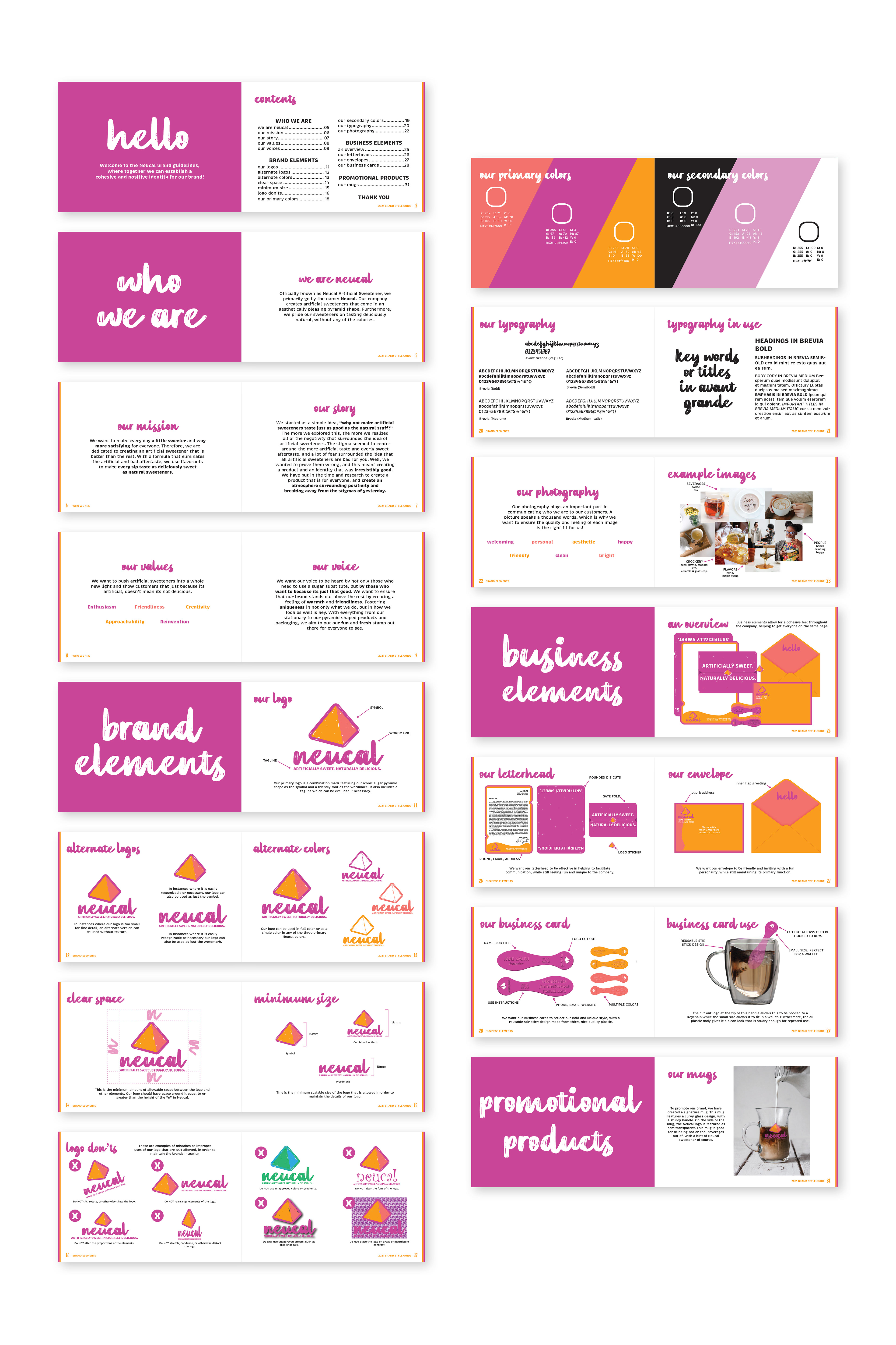 Part of a brand identity campaign for a fictional artificial sweetener company, Neucal. This is a comprehensive style guide meant to help establish voice, values, and cohesion between elements within the company.