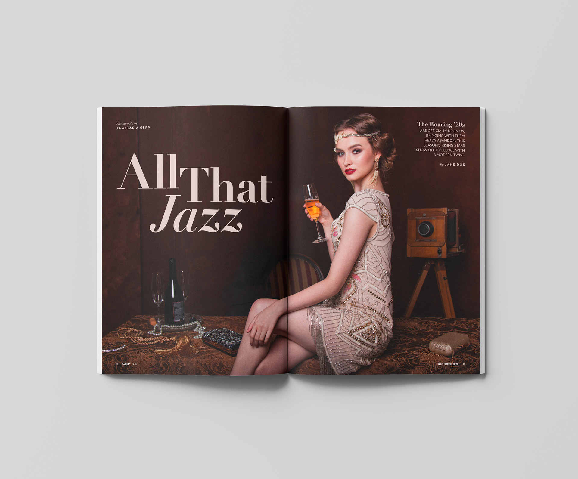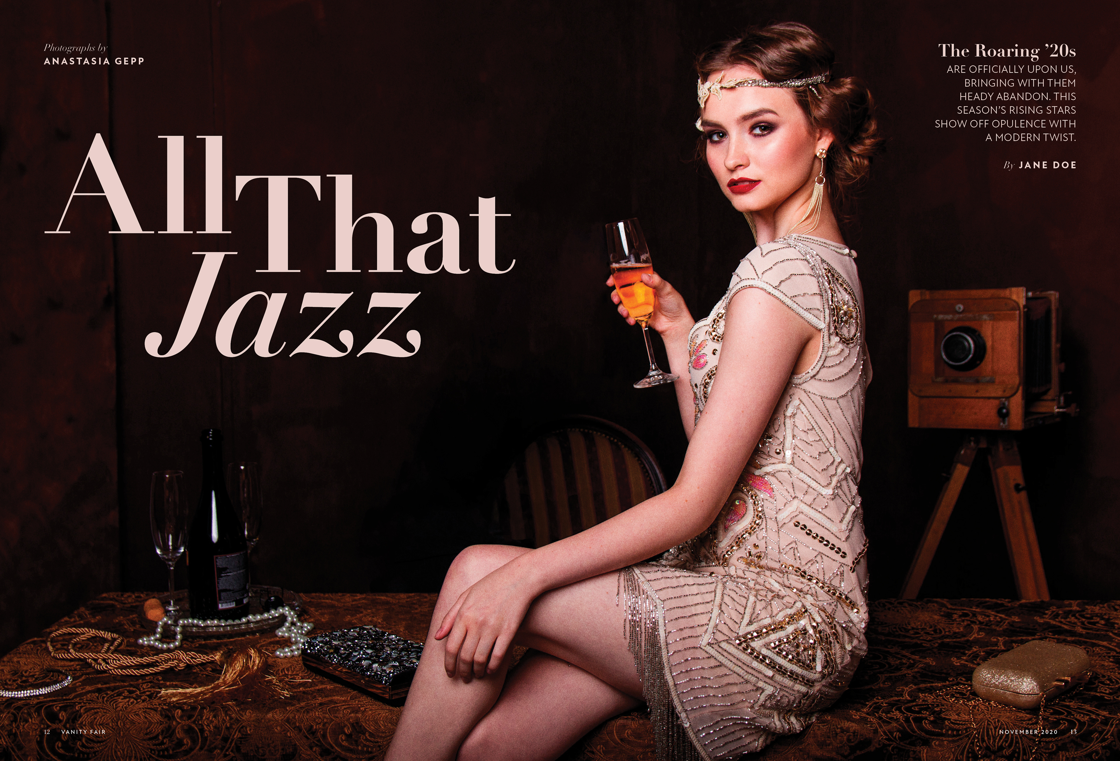 Redesigned magazine spread emulating the look and feel of the well-known magazine Vanity Fair.